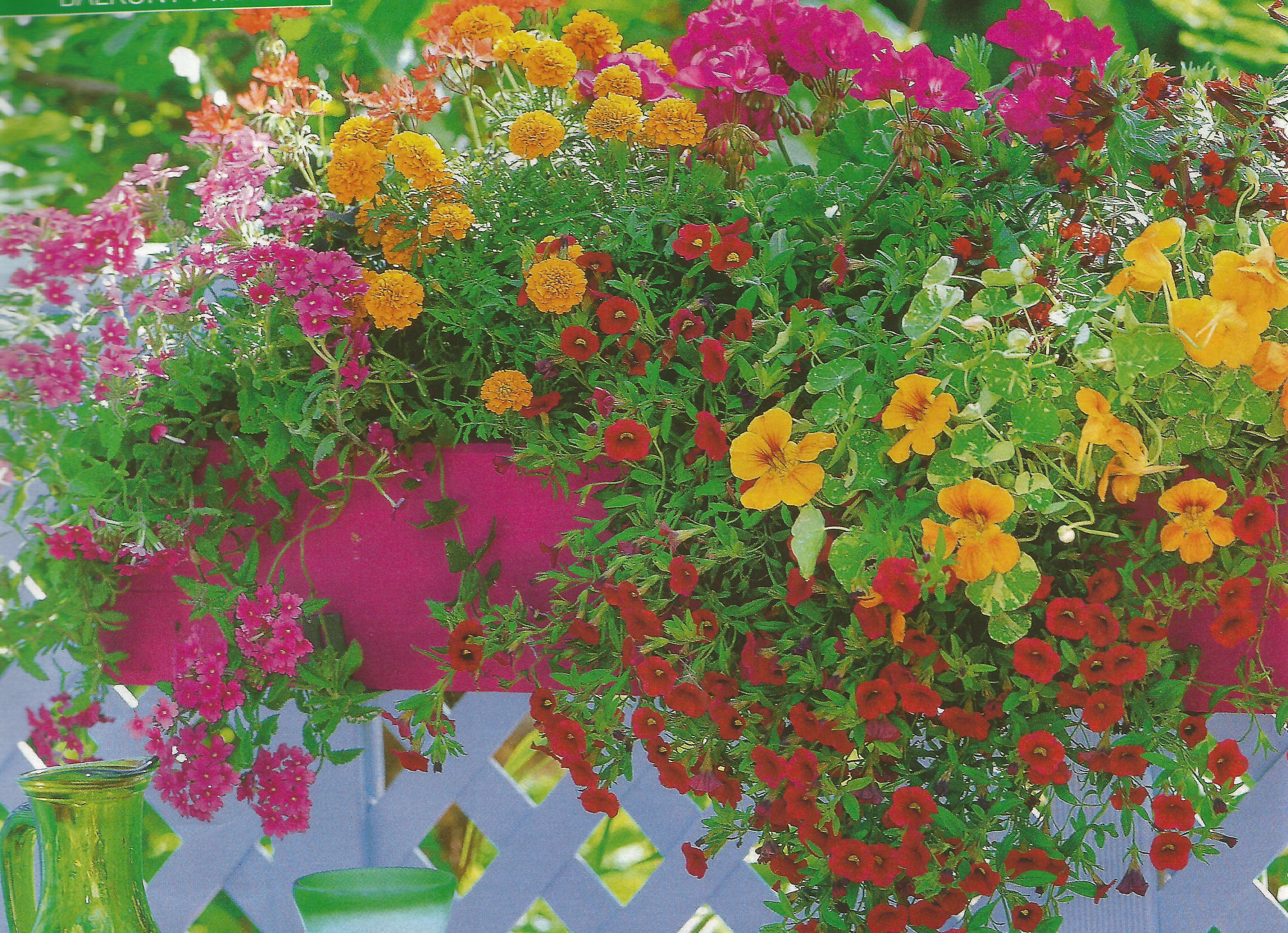 Kwitnące rośliny jednoroczne o kwiatach w kolorach pomarańczowym, różowym i czerwonym wyglądają bardzo nowocześnie i niosą bardzo pogodny przekaz. Zaprezentowane rośliny są niewymagające i kwitną całe lato. Potrzebuję tylko słońca. W skrzynce posadzono: 1. różową werbenę, 2. pomarańczowoczerwoną pelargonię (odmiana Scarlet), 3. pomarańczową aksamitkę, 4. różową pelargonię Pelargonium zonale, 5. czerwoną kalibrachoe Deep Red, 6. kufeę, 7. nasturcję Alaska o kremowo nakrapianych liściach.